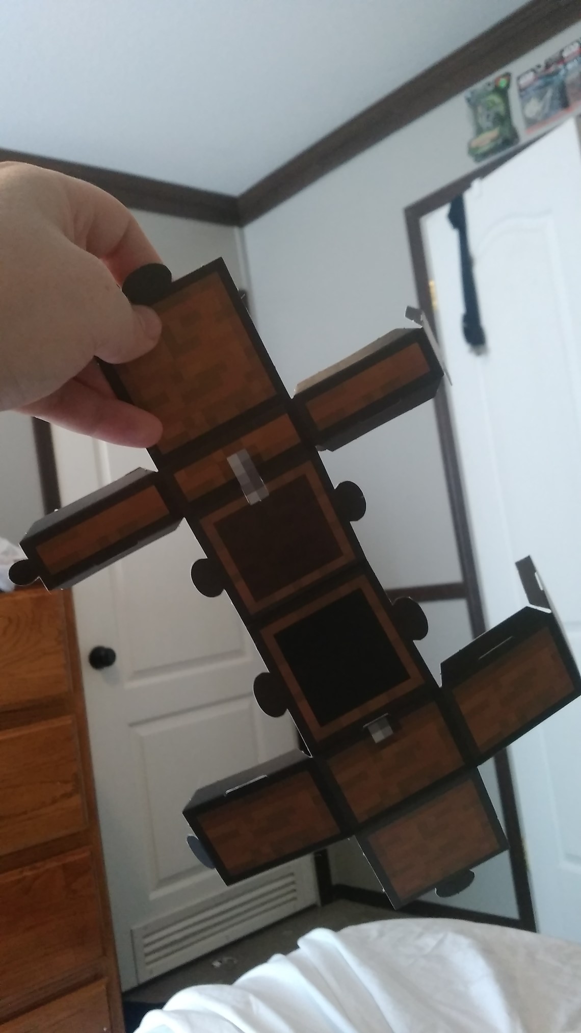 The bookshelves were pretty straight forward. They were exactly like the home made cardboard dice my mother made when I was a kid. But it took me a minute to figure out how the chest was supposed to go together. (I didn’t think to look through all those cardboard sheets for the instructions.)