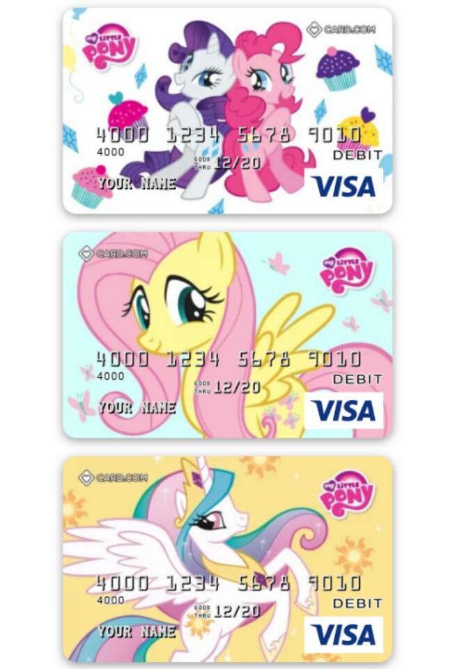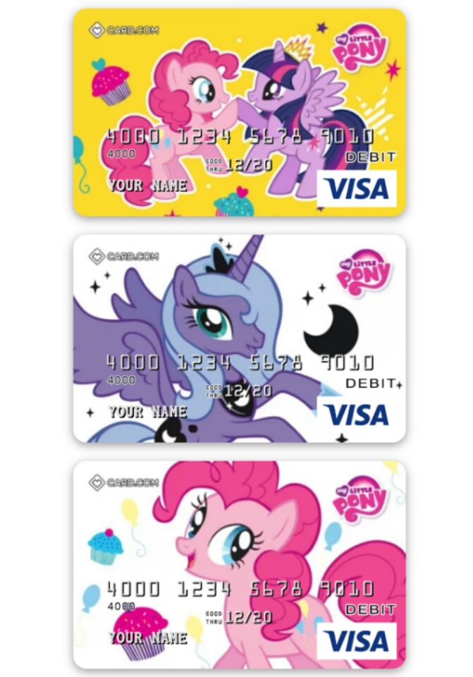 Card.com is offering My Little Pony prepaid Visa debit cards. Twenty versions are featured on the website depicting Twilight Sparkle, Apple Jack, Pinkie Pie, Rarity, Fluttershy, Rainbow Dash, Spike, Celestia and Luna, with a few group images and alternate pictures.
