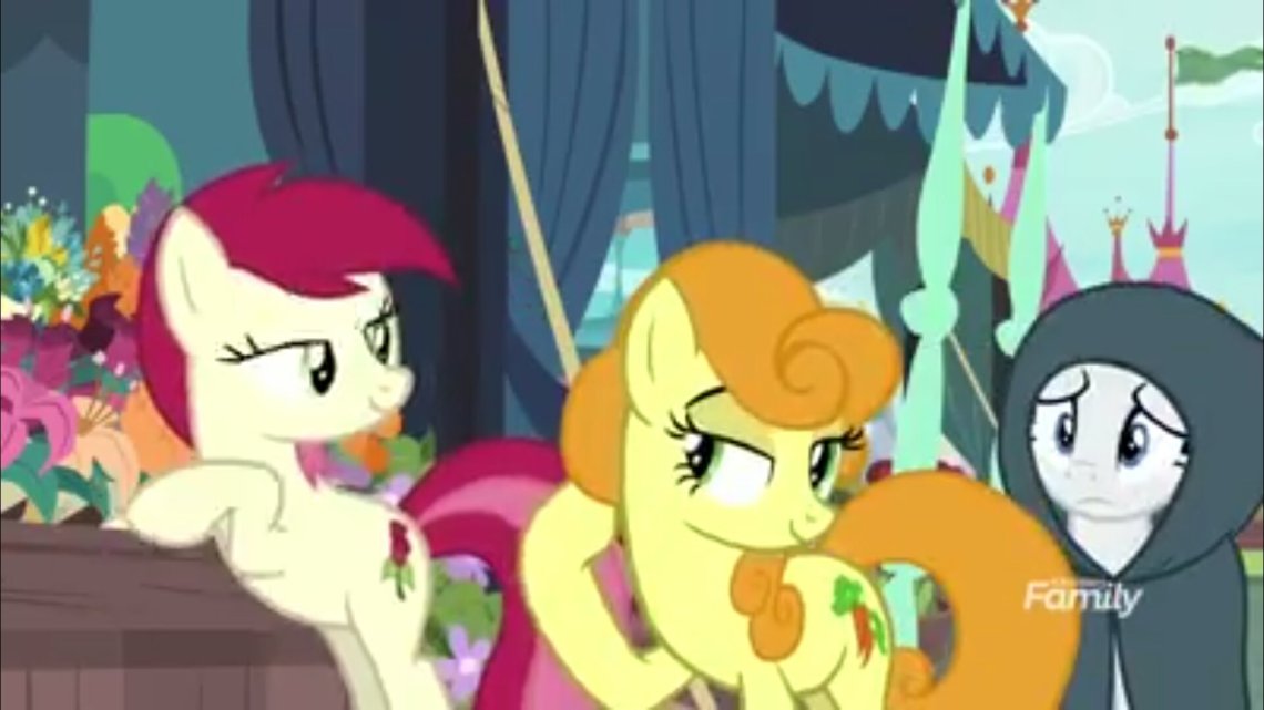 In ” It Isn’t the Mane Thing About You,” Rarity loses her mane and starts wearing a black hooded cloak like a Death Eater. Soft spoken with her head down, she notices ponies treating her as if she were invisible.
