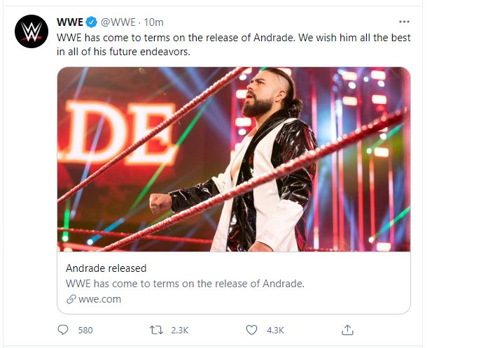 Earlier in the day, Andrade sent a cryptic tweet promising “good news.” A week prior, Andrade confirmed rumors that he was seeking his release from WWE. Originally meant to be released in April of 2020, Andrade remained with the company, yet rejected several ideas for his return. Since April, the WWE also fired Zelina Vega, Andrade’s manager for several years. Reportedly, the reason for Vega’s firing was because of her OnlyFans account.