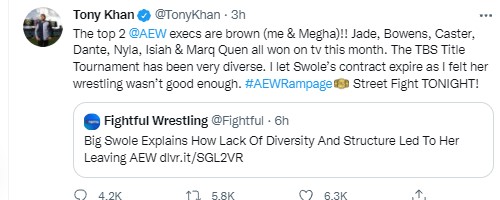 Sharing the Frightful Wrestling, AEW president Tony Khan responded that he and another executive are people of color and cited examples of minority wrestlers showcased in victories in December. He added that he was the one who allowed Swole’s contract to expire because he “felt her wrestling wasn’t good enough.”