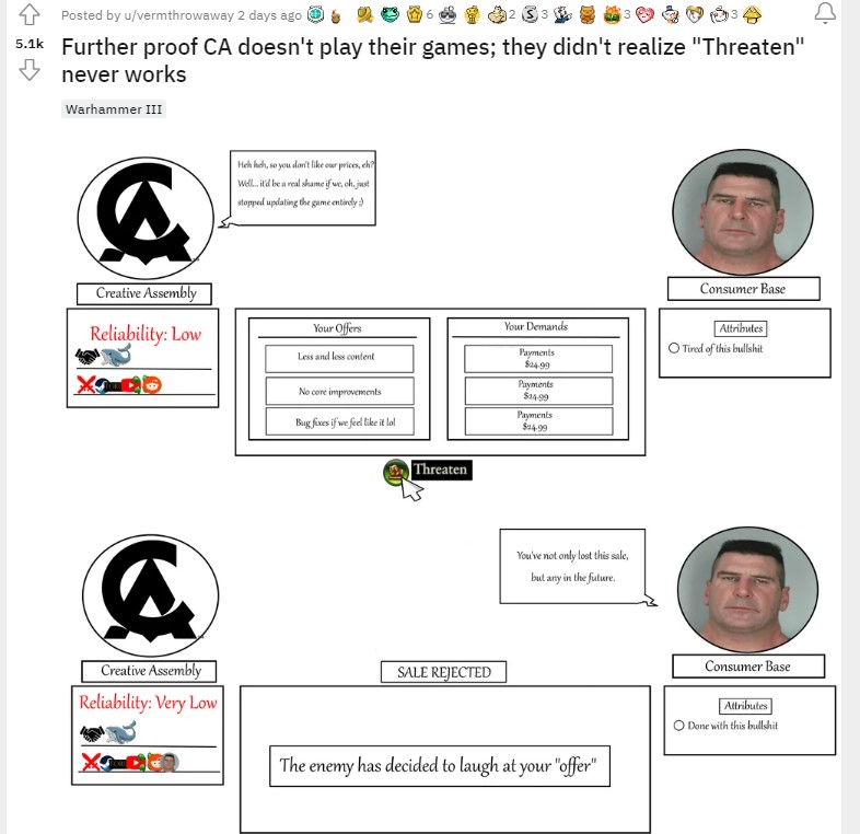 This statement did not go over well with the Total War community. Many Reddit users and content creators felt that the quoted statement was a veiled threat to stop support on the game, just as CA had done with “Total War: Three Kingdoms” in 2021.